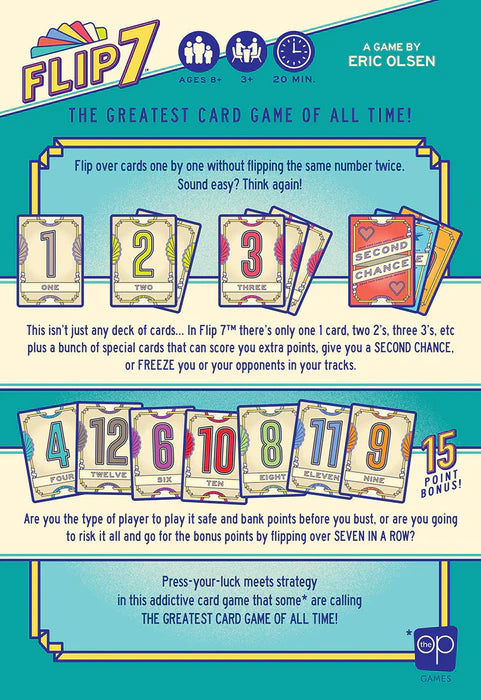 3–99 Players | Age: 8+ | Flip over cards one by one without flipping the same number twice. Sound easy? Think again! This isn't just any deck of cards… In Flip 7 there's only one 1 card, two 2's, three 3’s, etc plus a bunch of special cards that can score you extra points, give you a second chance, or freeze you or your opponents in your tracks. Are you the type of player to play it safe and bank points before you bust, or are you going to risk it all and go for the bonus points by flipping over seven in a row? Press your luck meets strategy in this addictive card game that's sure to be the greatest card game you’ve ever played! —description from the publisher