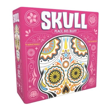 3–6 Players|Age: 10+|Edited description from Bruno Faidutti's write-up of the game in his Ideal Game Library: Skull & Roses is the quintessence of bluffing, a game in which everything is played in the players' heads. Each player plays a face-down card, then each player in turn adds one more card – until someone feels safe enough to state that he can turn a number of cards face up and get only roses. Other players can then overbid him, saying they can turn even more cards face up. The highest bidder must then turn that number of cards face up, starting with his own. If he shows only roses, he wins; if he reveals a skull, he loses, placing one of his cards out of play. Two successful challenges wins the game. Skull & Roses is not a game of luck; it's a game of poker face and meeting eyes. Skull & Roses Red features the same gameplay as Skull & Roses, with the only change being alternate rules that allow each player to control two biker gangs. Both Skull & Roses Red and Skull are playable on their own, with each game containing six different biker gangs. Each Skull or Skull & Roses set can be combined with another to allow for games with more than six players.