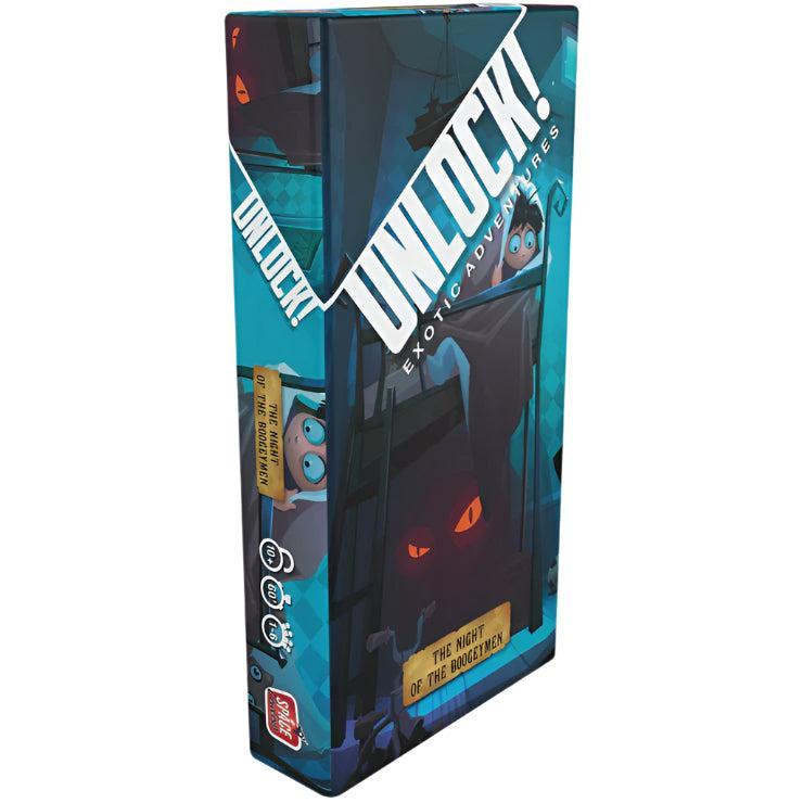 The Night of the Boogeymen is an Unlock! adventure for up to six players. With just one hour on the clock, players must work through a deck of sixty cards as a team, searching for clues, combining objects, and figuring out puzzles to solve the mystery and escape the countdown timer. The free Unlock! app runs the timer while providing clues, giving hints, and helping players succeed. Once the team has reached the solution and entered the correct code, they've escaped, and the game has been won!