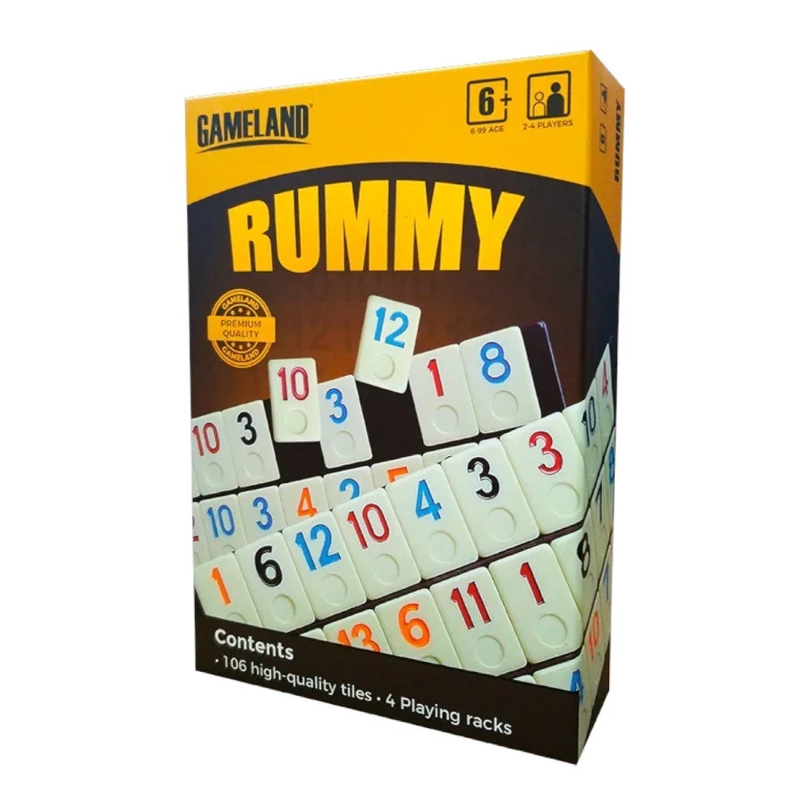 A game of Rummy, with 106 high quality plastic tiles, and 4 playing racks.