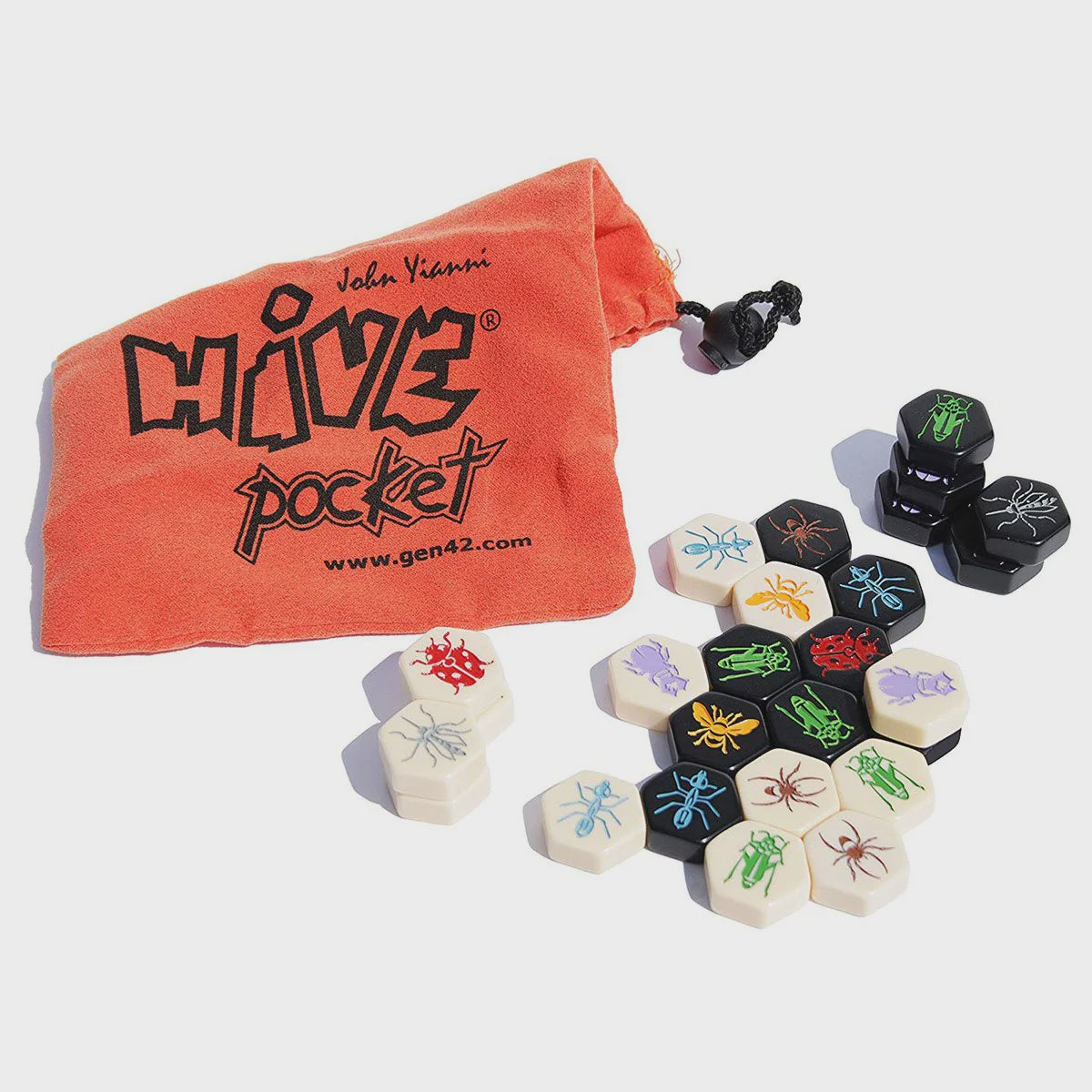 2 Players|Age: 9+|Hive is a strategic game for two players that is not restricted by a board and can be played anywhere on any flat surface. The base game of Hive is made up of twenty two pieces, eleven black and eleven white, resembling a variety of creatures each with a unique way of moving. Hive Carbon and Hive Pocket include the Mosquito and Ladybug expansions, for a total of 26 pieces.