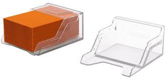 It is ideal for decks with 60 double-sleeved cards in standard inner sleeves and also holds Mini Snap and Slide Card Cases as well as Cube Pockets. Due to translucent materials and smart positioning of the closing flaps, the top card is fully visible from the outside without opening the box. The innovative secure click-lock mechanism protects your deck while still allowing easy access. The Bastion consists of 2 symmetrical parts that easily convert into a card pile and discard pile holder. It is perfect for a huge variety of trading card games. Thanks to its modular design, the Bastion fits perfectly into other Gamegenic products. It also comes with a write-on sticker for personalization. The Bastion is available in 10 different colors, including an exclusive mix & matched black/clear version.