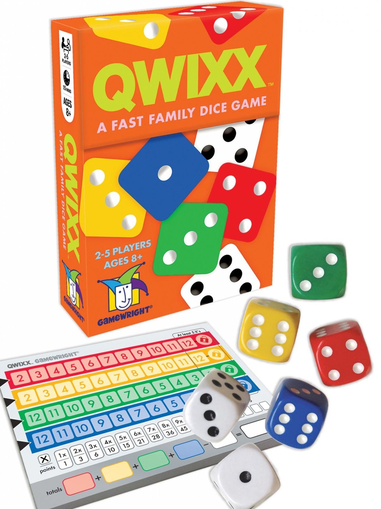 2–5 Players|Age: 8+|Qwixx is a quick-playing dice game in which everyone participates, no matter whose turn it is. Each player has a scoresheet with the numbers 2-12 in rows of red and yellow and the numbers 12-2 in rows of green and blue. To score points you want to mark off as many numbers as possible, but you can mark off a number only if it's to the right of all marked-off numbers in the same row.
