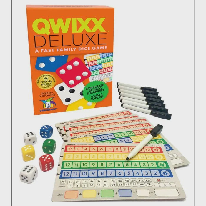 2–8 Players|Age: 8+|Qwixx Deluxe is a new edition of the Spiel des Jahres-nominated dice game. In this version everything is bigger, the players have boards with dry erase markers in place of the original paper and pencil. This edition is also for up to 8 players instead of only 5 in the original game. The biggest change in this edition, though, is that on the back of the regular player boards are the Qwixx Mixx boards that have the colors scrambled throughout the different lines, which changes many of the strategies while keeping the mechanisms largely the same.