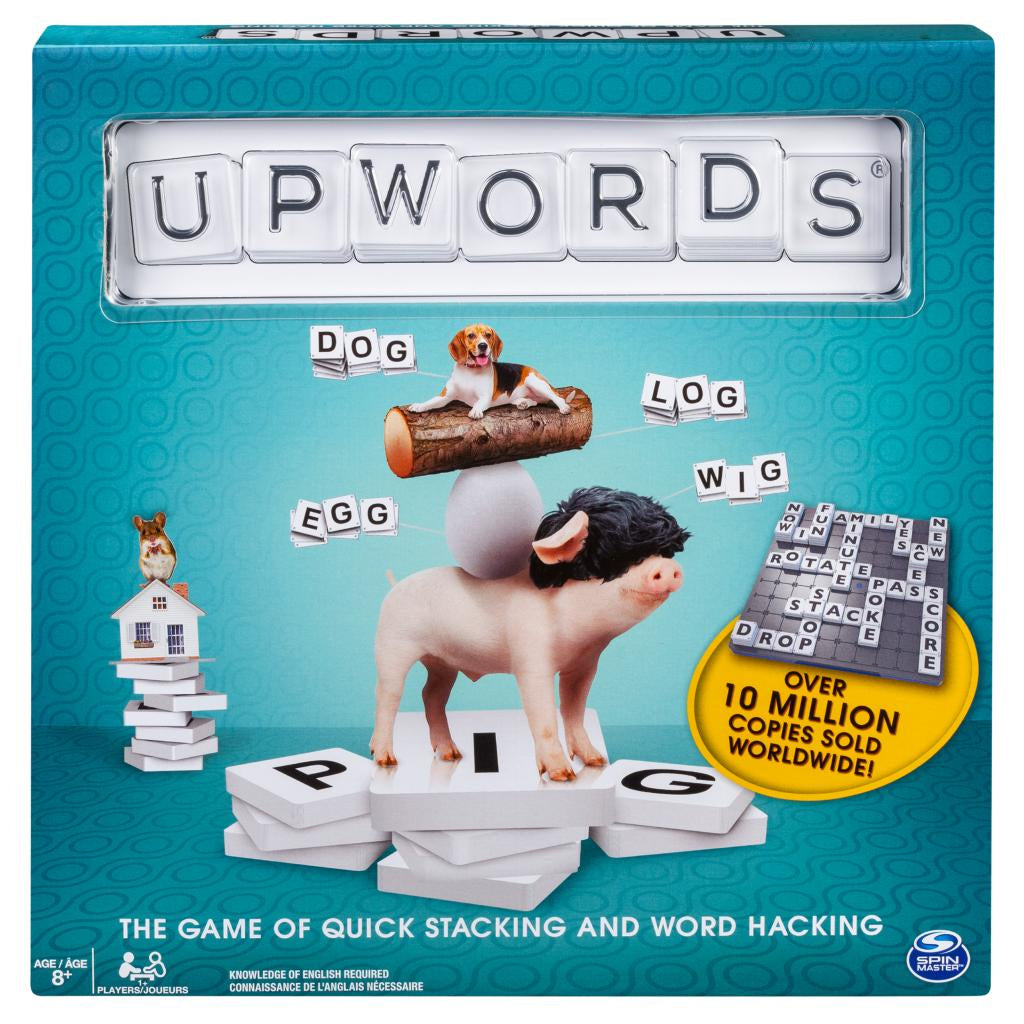 Upwords is the family game for kids and adults that you are missing in your game collection. Can you turn "dog" into "log"? You can with Upwords. In this high-stacking word game, players place tile letters onto the game board to create new words, or stack and build on top to change existing words. When it"s your turn, easily place your letters by rotating the lazy Susan game board in your direction. Earn points for words a single tile high and points for letters underneath the higher you stack, the higher you score. If you form two or more words in a single turn, you'll earn even more points. For additional word-hacking practice, you can improve your Upwords game play by playing solo. Hours of fun games await with this cool, brain-challenging board game for adults and kids.