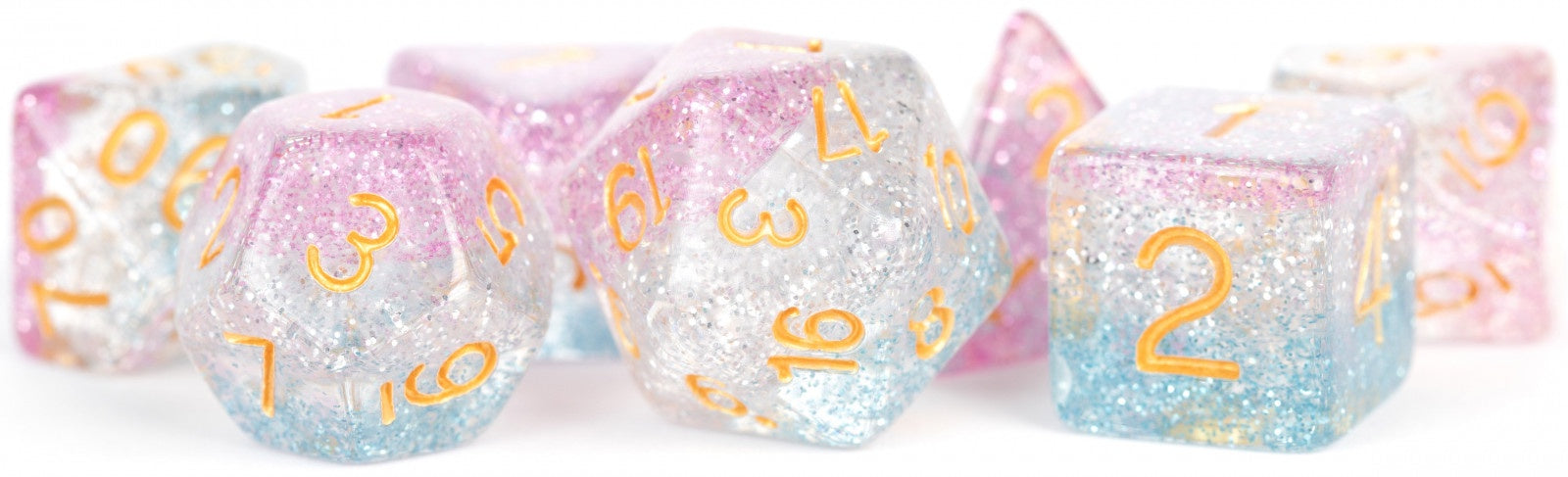 MDG resin dice have unique inclusions that add flare to any gaming table. These are full-sized 16mm polyhedral dice sets that come with 7 dice (d4, d6, d8, d10, d10%(00-90), d12, and d20).
