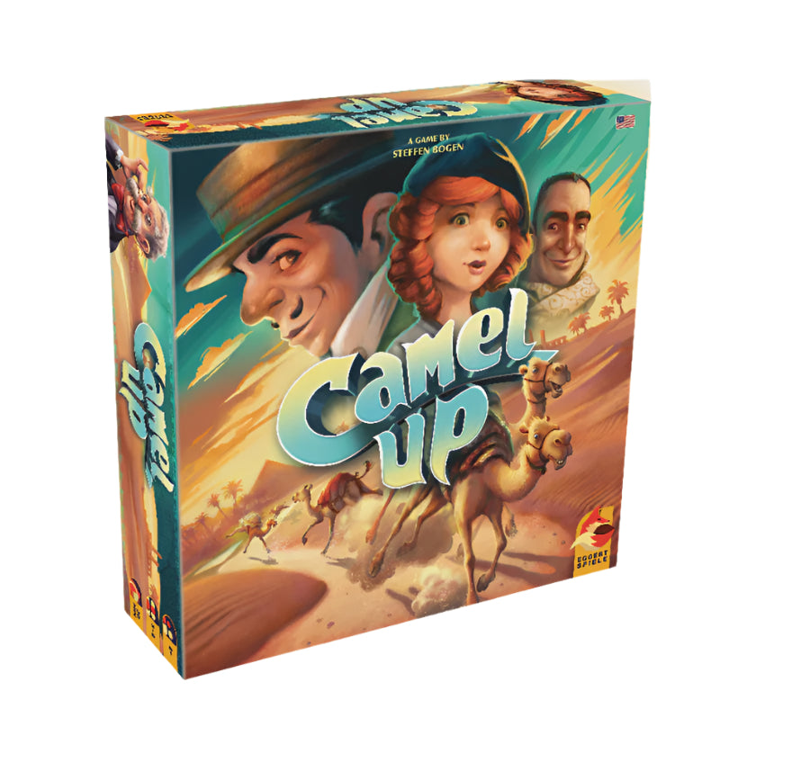 2–8 Players|Age: 8+|In Camel Up, up to eight players bet on five racing camels, trying to suss out which will place first and second in a quick race around a pyramid. The earlier you place your bet, the more you can win — should you guess correctly, of course. Camels don't run neatly, however, sometimes landing on top of another one and being carried toward the finish line. Who's going to run when? That all depends on how the dice come out of the pyramid dice shaker, which releases one die at a time when players pause from their bets long enough to see who's actually moving! Players roll all 5 dice to setup the start positions of the camels. On each leg, players pick one betting card for each color camel, showing how many coins they will win/lose, depending on the camel's position after the leg. The dice are then rolled in the pyramid dice roller, which allows one die to come out at a time and moves the matching color camel. Players can also place oasis cards to earn extra coins. After all 5 camels are moved, bets are resolved and a new leg start. Play continues until a camel passes the finish line. Once a camel crossess the finish line, all end of race bets are resolved and the player with the most coins wins.