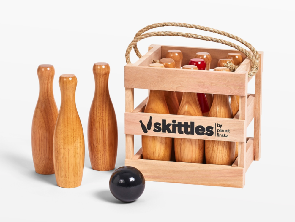 This handy crate of classic timber skittles will bring hours of fun to young and old. Just add your own indoor or outdoor “alley” & get skittling. Players score by rolling each of the three balls to knock as many of the pins down as they can. Some variations of this ancient game only allow points to be scored if the “king pin” has fallen.