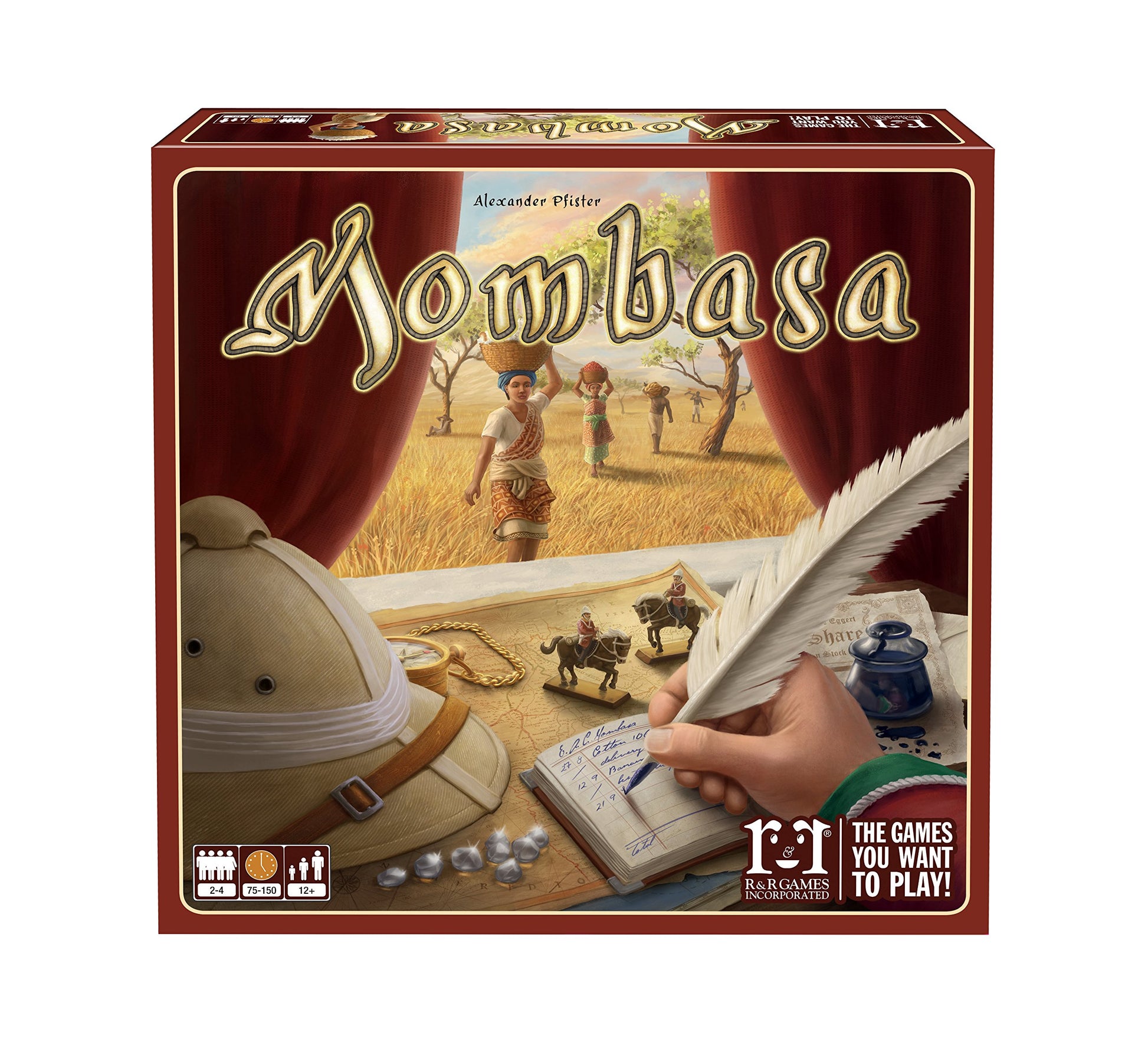 2–4 Players|Age: 12+|In Mombasa, players acquire shares of chartered companies based in Mombasa, Cape Town, Saint-Louis, and Cairo and spread their trading posts throughout the African continent in order to earn the most money.