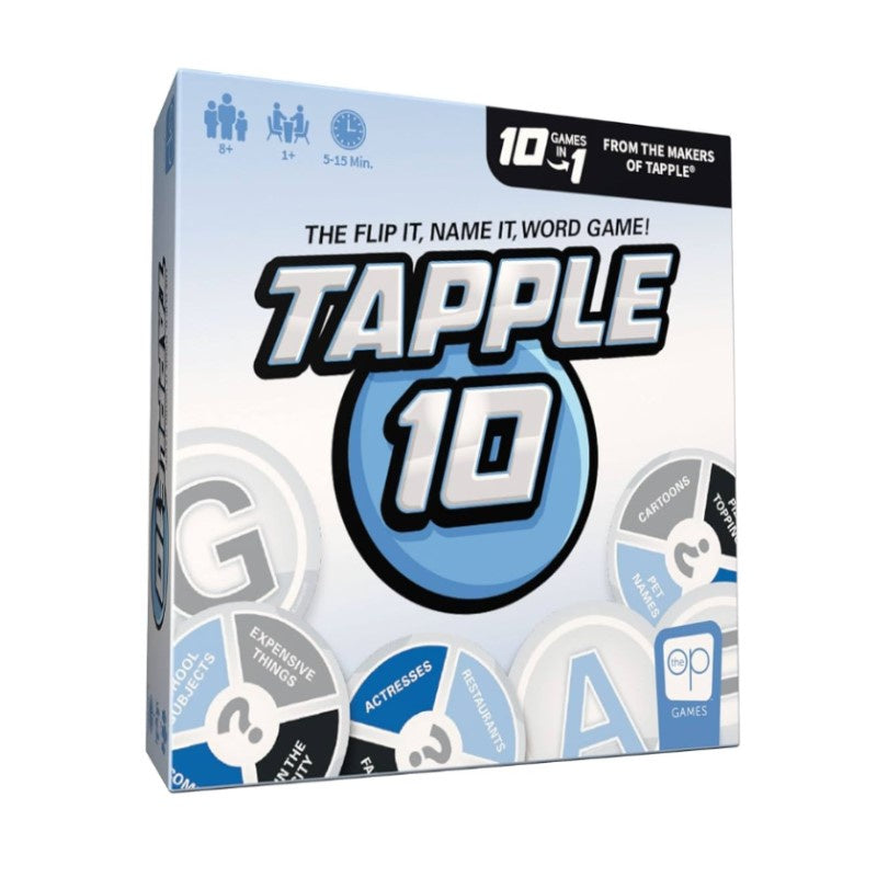 1 Players|Age: 8+|Tapple 10 offers 10 unique games that are challenging and fun for the whole family. The Tapple 10 deck of 80 cards offers 160 different categories that will engage players of all ages, and comes packed in its own travel case with sand timer for fast word fun on-the-go. The included instruction booklet describes how to play each game, and the recommended number of players & difficulty level of each game.