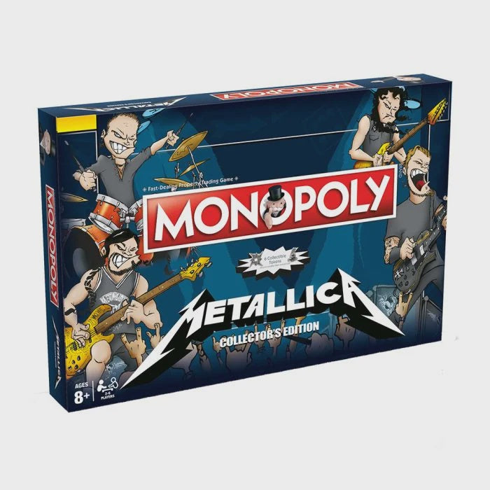 "The fast-dealing property trading game" just got faster! MONOPOLY METALLICA Collector's Edition takes the popular board game to a whole new level. Every aspect of the game designed for the true Metallica fan in mind. You'll "Pass Go" through historic Metallica events and locations around the board such as club shows, festivals, studios, childhood homes and other metal landmarks. Create your own real estate empire by adding arenas and stadiums to all your properties!