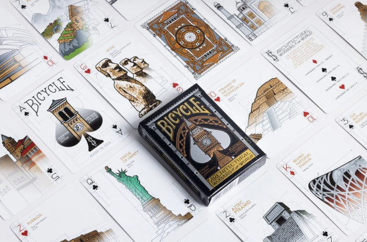 The Bicycle Poker sized architectural wonders of the world package contains embossed details and foil that further accentuate the beauty of the deck. 54 hand illustrated architectural marvels from across the globe, custom Ace of Spades and unique card back design. Premium embossed and foil package. Classic air-cushion finish for ease of shuffling and optimum performance.