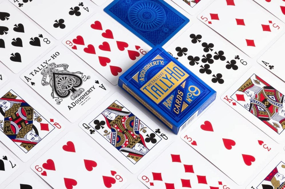 Tally-Ho MetalLuxe Playing Cards feature a Classic Linoid Finish that only The United States Playing Card Company can produce. It gives Tally-Ho playing cards that linen textured feel, and is what makes the cards glide off of one another smoothly while shuffling, and flourishing, for an optimum card-handling experience.