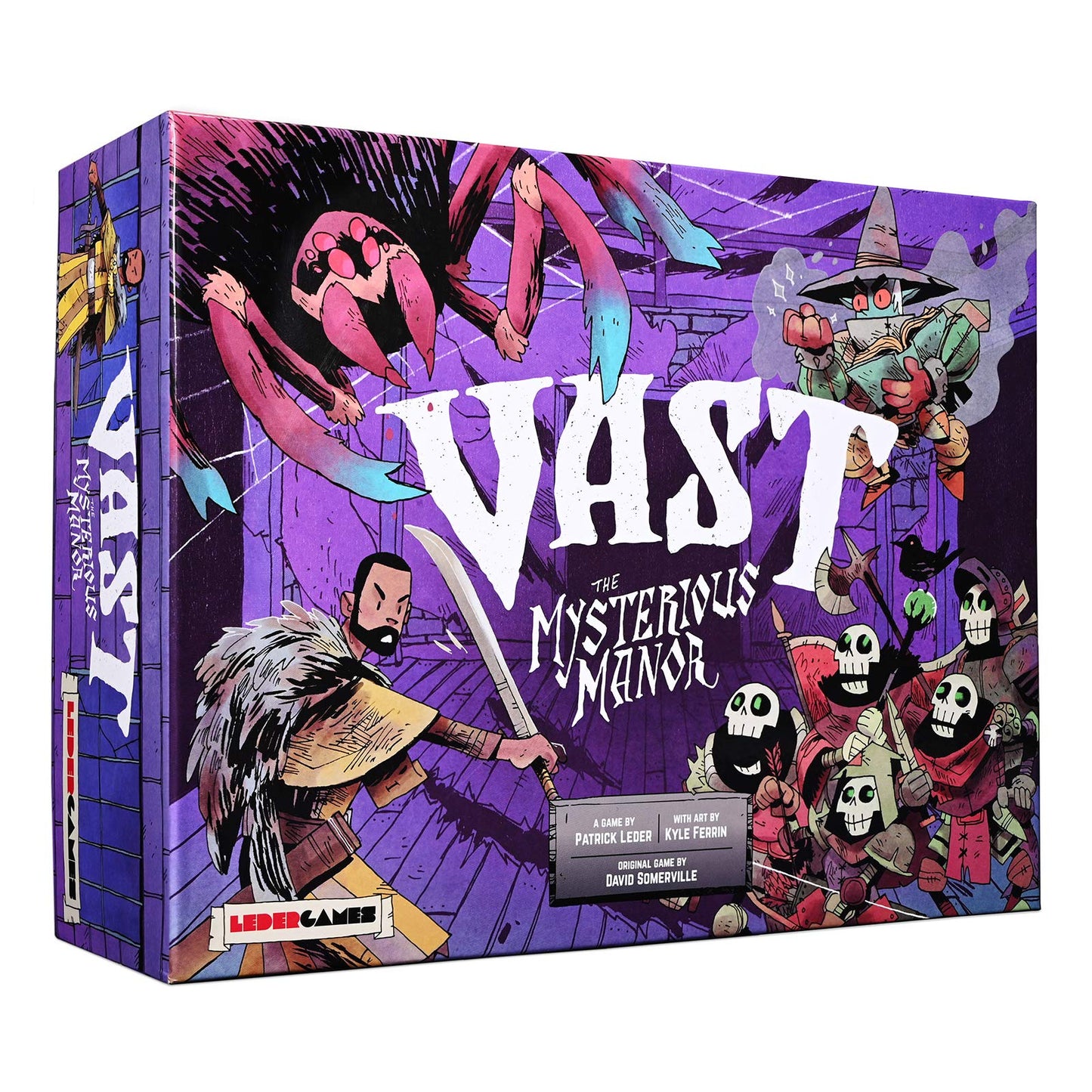 1–5 Players|Age: 13+|The manor has sat in the shady part of the valley abandoned for generations. The spider having escaped her abyssal prison is now seeking to return to her terrible glory, while the skeletal guards of this estate continue to stir in the darkness. The paladin has come to the manor, seeking atonement from the gods he must destroy the spider. Return to the world of Vast in a whole new adventure Vast: The Mysterious Manor. Vast takes you and your friends on an adventure in a haunted house, built on total asymmetry. There is no merry band of travelers here fighting evil. In Vast you take control of any part of the story. Play as the pious Paladin, the murderous Skeletons, the awesome Spider, or the Manor itself. In addition there is the Enchanter, come to this world to rule the minds of the others. Each role has its own powers, pieces, and paths to victory...and there can be only one winner. As the ultimate asymmetric board game, Vast: The Mysterious Manor provides a limitless adventure, playable again and again as you and your friends explore the five different roles in different combinations. Leder Games will present the entire game with solo modes, many combinations of characters, and full games. For the first time Vast will come with a board, to hold the tiles that form the Manor. In addition Vast: The Mysterious Manor will be compatible with Vast: The Crystal Caverns and Vast: The Fearsome Foes.' —description from the publisher